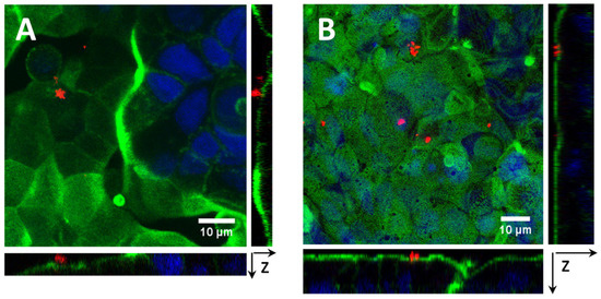 For the observation of the microdevices’ interaction with cells, enterocyte-like layers were incubated for 24 h with M41-RhB-L and M41-EOCC6-L. After the incubation, cell monolayers were washed twice with PBS and fixed with 4% PAF for 30 min at room temperature. After washing, cells were permeabilized with 0.1% Triton ×100 for 5 min, and the process was stopped with blocking buffer solution (1% BSA in PBS) for 20 min. Cells were then stained with 0.1 nM Alexa Fluor 488 Phalloidin (M41-RhB-L treated cells) or Alexa Fluor 594 Phalloidin (M41-EOCC6-L treated cells) for 30 min to localize actin microfilaments. In order to localize cell nuclei, all the cells were stained with Hoechst 33,342 at a concentration of 5 µg/mL for 5 min. CLSM images were acquired using excitation wavelengths λex = 405, 488, and 546 nm.