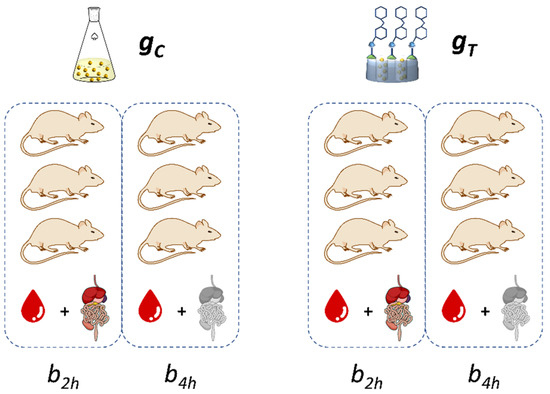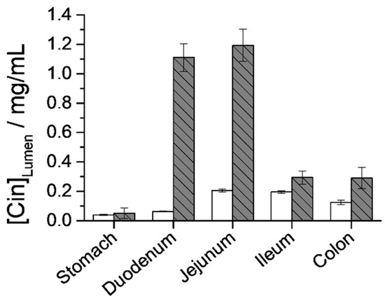 In vivo experiments with M41-Cin-L in a Wistar rat model were carried out in order to study the concentration of cinnamaldehyde, free and encapsulated, in plasma and in the different gastrointestinal sections. The animal study was approved by the Scientific Committee of the Faculty of Pharmacy Universidad Miguel Hernández, Elche (project reference DI-MBS-02-15) and followed the guidelines described in the EC Directive 86/609, the Council of the Europe Convention ETS 123 and Spanish national laws governing the use of animals in research (Real Decreto 223/1988, BOE 67, 18-3-98:8509-8511). To perform the in vivo assays, 12 male Wistar rats were previously fasted for 4 h. Subsequently, six animals were assigned to the trial group (gT), who were orally administered 150 mg of M41-Cin-L (containing 13.6 mg of Cin). The other six animals were assigned to the control group (gC), who were administered an equivalent dose of free Cin (13.6 mg). To carry out the experiments, both groups were organized into two batches with three subjects per batch (n = 3), one in which the assay was finished at 2 h (b2h), and another in which the digestive process was allowed to complete for up to 4 h (b4h). Plasma samples were collected at 30, 45, 60, 90 and 120 min from the b2h batch of each group, and at 30, 45, 60, 90, 120, 180 and 240 min from the b4h batch, and then the animals were sacrificed. The GIT of all the animals were excised, and divided into their corresponding physiological segment (stomach, duodenum, jejunum, ileum and colon). The tissues were washed with PBS, in a three-fold volume of the tissue’s weight, and finally homogenized using a glass homogenizer with Teflon pestle. Both blood samples and homogenized tissues were centrifuged (8000 rpm, 10 min), and deproteinized with cold methanol. The concentration of Cin in each sample was determined by HPLC following the methodology described in Section 2.7.