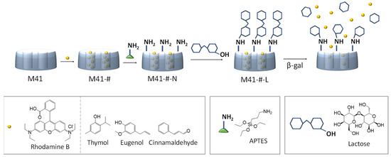 Mesoporous silica microparticles (M41) were prepared by the “atrane route” following previously described procedures [16]. A fluorophore (rhodamine B, RhB) and three EOCs (Thy, Eug and Cin) were loaded in the M41 microparticles (solids M41-#). M41-# supports were then reacted with APTES (solids M41-#-N) and lactose was attached to the solids by a condensation reaction between the saccharide’s anomeric carbon and the APTES-amino group to give the final capped solids (M41-#-N-L). As the pores are first loaded with RhB or EOCs the functionalization process with APTES and lactose is expected to occur mainly on the external surface of the M41 microparticles as shown in Scheme 1. In addition, EOCs-loaded lactose-capped materials with an additional hydrophilic fluorophore (coumarin 6, C6) were also prepared to carry out microscopy experiments.