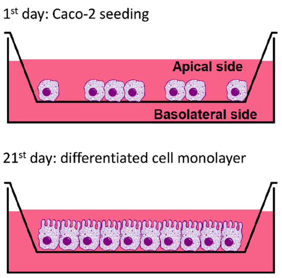 To obtain intestinal epithelium membranes, Caco-2 cells were seeded in six-well plates onto PET porous Millicell hanging cell culture inserts (Merck Millipore) (area 4.2 cm2; pore size 0.4 µm) in 2 mL of medium at a seeding density of 2.5 · 105 cells per insert in the apical side. Then, 3 mL of medium were added in the basolateral compartment. Culture medium was changed every 2–3 days and the seeded cells were grown for 21 days to allow cell differentiation into enterocyte-like cells, characteristic enzymes production and tight junctions formation [86]. Before starting all the experiments, transepithelial electrical resistance (TEER) of each insert was measured to confirm the correct formation of confluent intestinal monolayers.