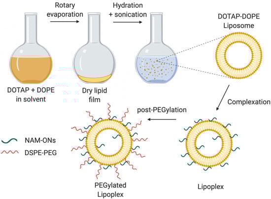 Schematic representation of the preparation of the PEGylated DOTAP–DOPE liposomes and lipoplexes. The liposomes, resulting from the hydration of a lipid film composed of DOTAP and DOPE, were incubated with the negatively charged HiLyte 488 labeled ONs to form lipoplexes. The post-PEGylation was achieved by adding DSPE-PEG at a final concentration of 10%. Created using BioRender.com. (Accessed on 1 June 2021).