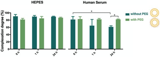 Figure 2 shows a high degree of association between NAM-ONs and liposomes in HEPES buffer (over 24 h), with more than 80% of the NAM-ONs complexed to the liposomes, with and without PEG. Differently, after 24 h incubation in human serum, the same high level of NAM-ONs association (81%) was only achieved for PEGylated lipoplexes, while it was significantly lower for non-PEGylated lipoplexes (61%). Fast release of siRNA in serum was observed before from non-PEGylated DOTAP–DOPE liposomes []. Differently, in liposomes also containing 10% (v/v) DSPE-PEG, more than 90% release of siRNA was reported after 1 h incubation in human serum by Dakwar et al. []. However, it should be noted that in that study the pre-PEGylation was performed by including DSPE-PEG already in the initial lipid mixture before vesicle formation. Instead, in the present work, post-insertion of PEG chains, i.e., after vesicle formation, was used. This is the first time that the release of ONs from post-PEGylated lipoplexes has been studied, and our results suggest that post-PEGylation provides a shielding effect, preventing the release of ONs in serum. This, together with the already proven colloidal stability of the used liposomes in blood [], is a promising result for a successful in vivo administration. Nonetheless, future work could also consider the effect of the circulatory flow rate to mimic in vivo hydrodynamics before validation.