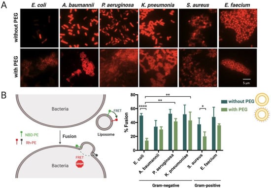 After proving that the liposomes are able to stably transport NAM-ONs in human serum, we aimed to investigate liposomes’ capability to interact and fuse with different bacterial envelopes, as this is required for intracellular delivery of ONs in bacteria, and the effect of PEG in such interaction. Different clinically relevant bacteria responsible for bloodstream infections were used: Escherichia coli K12, Staphylococcus aureus Mu50, Acinetobacter baumannii, Enterococcus faecium, Klebsiella pneumoniae and Pseudomonas aeruginosa, and incubated with empty liposomes, with and without PEG. The interaction between bacteria and empty liposomes was analyzed using epifluorescence microscopy (Figure 3A), and their fusion with bacteria was quantified by a lipid-mixing assay (Figure 3B).