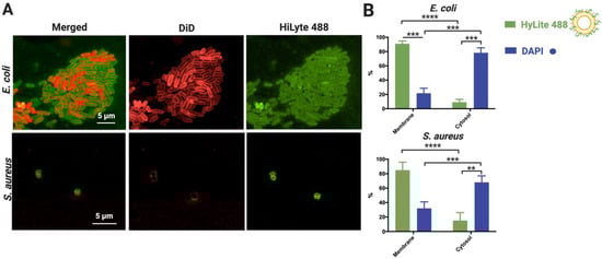 Assessment of HiLyte 488 labeled NAM-ONs internalization by post-PEGylated lipoplexes in HEPES buffer, upon 1 h incubation. (A) Representative CLSM images of E. coli (top) and S. aureus (bottom) showing NAM-ONs (green fluorescence) internalized in the cytosol. Bacterial membranes were labeled with DiD dye (red fluorescence). Merged and separate channels are represented. Scale bar represents 5 μm. (B) Percentage (%) of NAM-ONs localized in the cytosol and in the membrane, calculated using Equation (4). A DAPI control of cytosol labeling was performed. Three independent experiments were done. Results are represented as mean values and respective standard deviations. Statistical differences are indicated when appropriate (p ≤ 0.0001, ****; p ≤ 0.001, ***; and p ≤ 0.01, **).