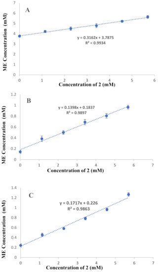 Phase solubility diagram of ME in presence of different concentrations of sulfonatocalix[4]naphthalene at temp. 25.5 ± 0.5 °C. (A) Phosphate buffer of pH 7.4, (B) pH 1.2, and (C) distilled water.