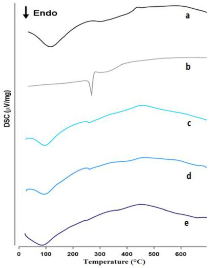 Thermal analysis is an important method for the recognition and characterization the formation of complexes between drugs and their carrier [47]. DSC is the most commonly employed technique to assess the number of amorphous phases existing in systems containing more than one component [48] and a valuable method for detecting drugs interaction and compatibility with excipient [49,50]. Therefore, the thermal behavior of ME, sulfonatocalix[4]naphthalene, solid complexes, and physical mixture were studied using DSC to characterize the possibility of complexation and/or any possible interaction. The DSC thermograms of sulfonatocalix[4]naphthalene, ME alone, and respective solid systems are shown in Figure 2. The DSC thermogram of ME alone, Figure 2, showed one main characteristic sharp endothermic melting peak at around 256 °C, which corresponds to its melting point [51]. Sulfonatocalix[4]naphthalene showed two major endothermic peaks, the first attributed to sampling dehydration at 100 °C and the second peak refers to fusion or decomposition at 750 °C. The DSC thermograms of the physical and kneaded mixtures of the drug revealed that the intensity of the endothermic melting point peak of ME was highly decreased and shifted to the lower temperature around 245 °C and 243 °C, respectively. However, in the case of a coevaporate mixture, the complete disappearance of drug melting endotherm was observed. These results revealed some sort of molecular interaction between ME and sulfonatocalix[4]naphthalene. Much more information about the type of interaction with the possibility of complex formation as well as the conversion of ME from crystalline to an amorphous or partially amorphous structure will be investigated from XRD, FT-IR, and other performed studies.