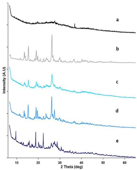 The PXRD is performed to get much more evidence about the interaction between ME and sulfonatocalix[4]naphthalene. The PXRD pattern of ME, sulfonatocalix[4]naphthalene, and their corresponding 1:1 molar ratio powdered systems are shown in Figure 4. The X-ray diffraction of the sulfonatocalix[4]naphthalene did not show diffraction peaks indicating its amorphous pattern (as illustrated in Figure 4, trace a). On the contrary, ME showed several sharp high-intensity peaks values at 2θ diffraction angle of 13.2 (1022), 15.0 (1477), 18.8 (1136), 26.2 (2431), 30.1 (568), and 36.3 (477), indicating its crystalline nature (as illustrated in Figure 4, trace b) [55]. Physical and kneaded solid systems still reflected the crystalline peaks of ME; however, they were reduced in their intensity and became broader. Thus, this feature delineates the incomplete complex formation between sulfonatocalix[4]naphthalene and ME, which could possibly be attributed to the method and/or the low amount of sulfonatocalix[4]naphthalene in the prepared systems. However, the diffraction peaks of ME completely disappeared in the coevaporate product concomitant with the appearance of new XRD sharp peaks at 2θ diffraction angle at position 10.0 (363), 19.1 (613), and 23.8 (590). This behavior could be possibly attributed to the formation of an inclusion complex between the ME and sulfonatocalix[4]naphthalene and/or the formation of a new complex compound with some crystallinity. Similar findings were also reported by other researchers, who concluded that the formation of new sharp peaks in XRD confirmed the formation of an inclusion complex with the investigated host molecule [56,57]. In addition, these results agreed with DSC result, which confirmed the disappearance of characteristic melting endotherm of ME observed in the coevaporate product. Conclusively, XRD data confirmed the formation of an inclusion complex.