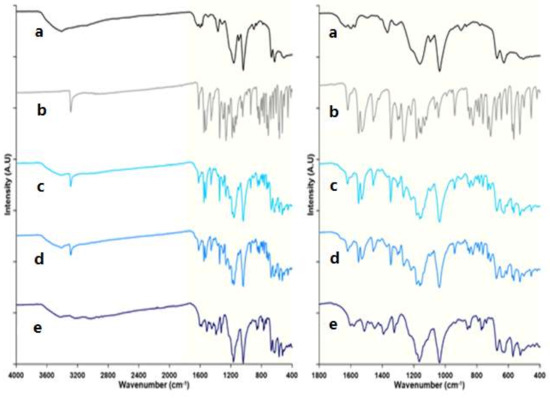 FTIR spectra of following: (a) sulfonatocalix[4]naphthalene (C), (b) meloxicam (ME), (c) physical mixture (PM), (d) kneaded (KN), and (e) coevaporate (CO) powders.