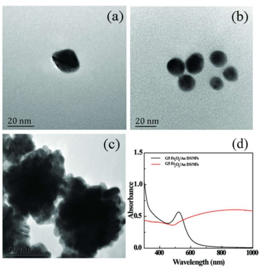 USIO NPs were first synthesized to be used as seed particles. The results of TEM showed that the diameter of formed USIO NPs is 2.6 ± 0.61 nm (Figure S1a,b). Amine-terminated G5 PAMAM dendrimers-stabilized gold nanoflowers were prepared by a self-reduction method, which displayed a size around 20 nm (Figure 1a). Meanwhile, the particles of Fe3O4/Au DSNPs at the size of 15 nm (Figure 1b) were obtained by EDC-activated USIO NPs which reacted with Au DSNPs by an amide linkage. The size of the Fe3O4/Au DSNPs measured by TEM is smaller than the individual Au DSNPs, indicating the remarkable interaction between Au DSNPs and USIO NPs, in accordance with the results reported by previous literature [15]. After Fe3O4/Au DSNPs merge with an Au growth solution, their sizes gradually grow to 98 nm. It is clear to see the nanoflower structure as shown in Figure 1c.