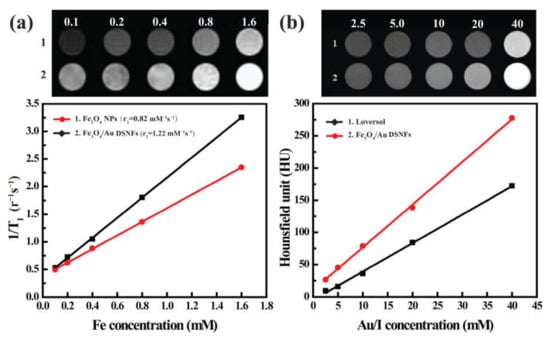 CT and MR imaging properties of the Fe3O4/Au DSNFs. (a) T1-weighted MR images and linear fitting of 1/T1 of the Fe3O4 NPs and Fe3O4/Au DSNFs at diverse Fe concentrations (1 and 2 refers to USIO NPs and NFs, separately). TE = 12 ms, TR = 377 ms, and ST = 2.0. (b) CT images and CT values (HU) of Loversol and Fe3O4/Au DSNFs with diverse concentrations of the radiodense element of Au or I (1 and 2 refers to Omnipaque and NFs, respectively).