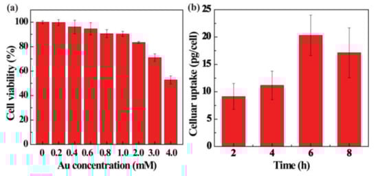 (a) Cell viability of Fe3O4/Au DSNFs cultured with Raw264.7 cells in different Fe concentration. (b) Cellular uptake of Fe3O4/Au DSNFs with MAs for 2, 4, 6, and 8 h.