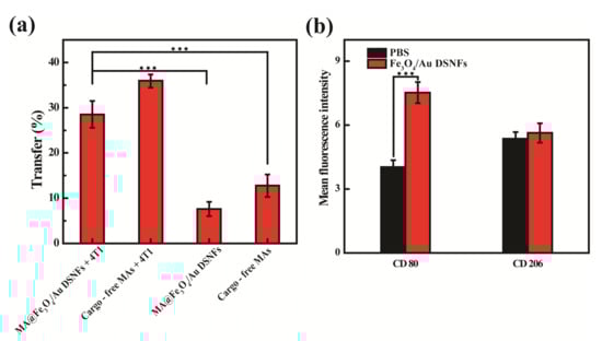 Tumor tropism is a typical peculiarity of macrophages because it can be guided by chemokines and cytokines to the inflammation site. The transwell migration experiment was designed to verify whether the functional properties of macrophages have changed after Raw264.7 cells were incubated with the Fe3O4/Au DSNFs for 18 h (Figure 4a). In this experiment, 4T1 cells were utilized. It can be seen that the presence of 4T1 cells has a significant effect on the migration rate of Raw264.7 cells, which is about three times than that in the absence of 4T1 cells. Although the cell migration rate was slightly reduced after co-incubation with Fe3O4/Au DSNFs compared with free MAs, the tumor tropism of MA@Fe3O4/Au DSNFs was still significant. It indicates that the activities and roles of Raw264.7 cells are not influenced posterior to the uptake of the Fe3O4/Au DSNFs.
