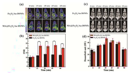 In vivo tumor MR and CT imaging. (a) In vivo T1-weighted MR images and (b) the corresponding MR SNR of the 4T1 tumor anterior to injection and at diverse time points post-injection of Fe3O4/Au DSNFs and MA@Fe3O4/Au DSNFs ([Fe] = 100 μg, in 0.2 mL PBS for every mouse), separately (mean ± S.D., n = 3). The MR signal intensity of blank (air) was utilized as the background (noise). TE = 12 ms, TR = 377 ms, and ST = 2.0. (c) CT images and (d) corresponding CT values of the 4T1 cancer in ICR mice before and at diverse time points post intravenous injection of the Fe3O4/Au DSNFs and MA@Fe3O4/Au DSNFs ([Au] = 0.04 M, in 200 µL PBS for every mouse).