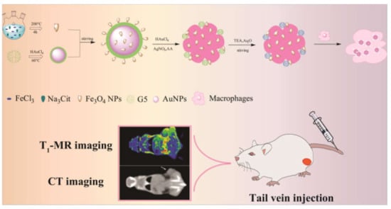 Toward these issues, tumor-directed cell-mediated drug delivery systems have become a major focus in cancer theranostics [23]. Specific cells are able to be used as vehicles to convey NPs across the cancer or along the cancer fringe to improve the accumulation of NPs. For instance, red blood cells [24], mesenchymal stem cells (MSCs) [25], neural stem cells [26], and macrophages (MAs) [27] have been regarded as effective tumor-targeting carriers. In addition, these cell-mediated delivery systems play to their inherent characteristics’ strengths, such as having the advantages of non-tumorigenic, low immunogenicity, and being able to cross certain physiological barriers in the body [28]. The FDA has approved a stem cells carrier to be used in clinical trials for glioma treatment. Among these cell vehicles [29], macrophages possess the unique advantages of minimized phagocytosis and extraction from peripheral blood, which is particularly critical in drug delivery. Previously, we have confirmed that MSCs-mediated delivery systems of nanogels with Fe3O4 NPs improved the magnetic MR effect in breast and glioma tumor models in comparison with free nanogels loaded with Fe3O4 NPs [30]. Recently, Guo et al. [31] treated ovarian cancer mice with macrophage-loaded doxorubicine (DOX) and found that macrophages entered the tumor tissue and effectively delivered the drug directly to cancer cells through a tunneling nanotube pathway. Moreover, it was found that the chemokine receptors CCR2 and CCR4 of drug-loaded macrophages were highly expressed, which enhanced the tropism of macrophages. Hence, it is logical to assume that USIO NPs could be loaded onto Au NFs and carried by cancer tropic macrophagocytes to reach tumors for better cancer MR/CT image formation.