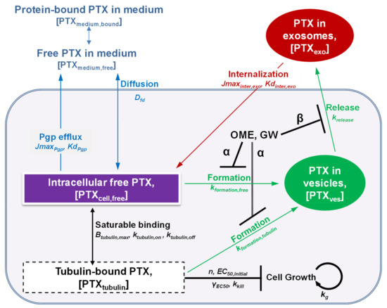 In this report, exosome-producing cells are denoted as Donor cells, exosomes collected from drug-treated cells are EXOdrug, and drug-naïve cells treated with EXOdrug are Recipient cells. All concentration terms are bracketed (e.g., [PTXcell,free] is concentration of intracellular free PTX). Subscripts are used to denote location (extracellular, intracellular, exosomes) and drug moieties with respect to binding or association (free, bound) with macromolecules or organelles (tubulin, vesicles, exosomes). Subscripts are used to denote the various drug entities and their locations. For example, PTXmedium,free and PTXcell,free are free (unbound) drug in medium and cells, respectively; PTXtubulin and PTXves are intracellular tubulin- and vesicle-bound PTX, and PTXexo is PTX in exosomes, respectively.
