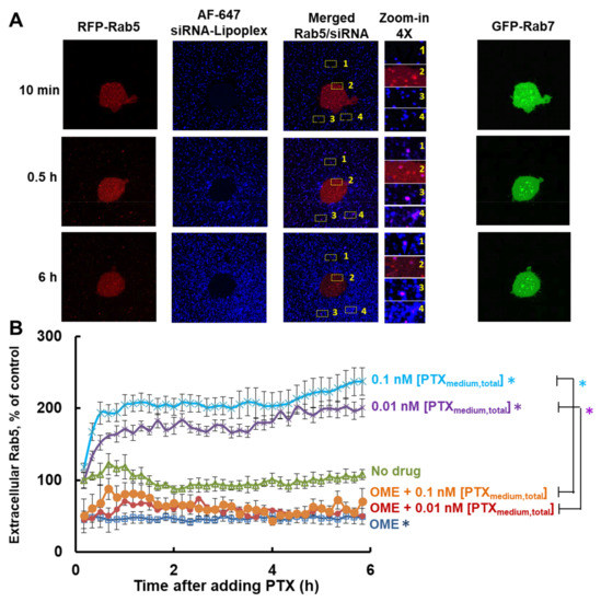 Time-lapse live cell confocal microscopy. RFP-Rab5- and GFP-Rab7-transduced MCF7 cells were treated with OME (29 µM or 10 µg/mL, 24 h), PTX (at [PTXmedium,total] of 0.01 or 0.1 nM, 6 h), or their combination (OME followed by PTX). Note the RFP-Rab5 or GFP-Rab7 transduction, in addition to highlighting the early or late endosomes, also produced faint diffused red or green fluorescence, respectively, throughout the cell (including the extended pods). Live cell confocal images were taken every 10 min for 6 h after adding PTX (n = 6 cells per group). The two control groups were without drug treatment or without OME pretreatment. The vision field of each image is 20 × 20 µm2. (A) Left 4 panels: representative confocal microscopic images showing vesicles containing both RFP-Rab5 (red) and AF647-siRNA (pseudo blue) in both intracellular and extracellular fluid (images taken at 2 h). Right panel: images of GFP-Rab7 (green) and AF647-siRNA. Note all intracellular or extracellular siRNA signals co-localized with Rab5 and none with Rab7. (B) Quantitative image analysis results. * p < 0.05 for the difference between three groups (single agent PTX or OME, or no drug control), and between the groups receiving single agent PTX (0.01 and 0.1 nM [PTXmedium,total]) and their corresponding combination with OME (repeated measures ANOVA). No statistically significant difference between single agent OME and OME + PTX groups (0.01 or 0.1 nM [PTXmedium,total]) (p = 0.56 or p = 0.47, respectively; repeated measures ANOVA). Mean ± SEM (6 experiments, duplicate samples per experiment).