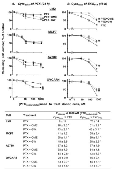 Figure 3B shows plots of Cytorecip of EXOdrug collected from Donor cells treated with PTX at different [PTXmedium,total] and OME (29 µM) or GW (10 µM), alone or in combination. In all 4 cells, EXOOME or EXOGW had no significant Cytorecip (<5%, not shown). In contrast, EXOPTX showed appreciable effects (e.g., Eobs,max of 58–86% with 1000 nM [PTXmedium,total]), which were reduced by OME or GW pretreatment (to 28 or 47%, respectively).