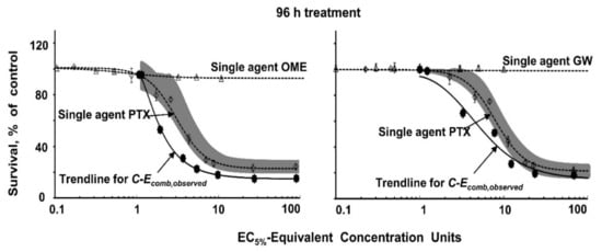 Analysis of drug interactivity. Drug interactivity analysis used two methods (curve shift and uncertainty envelope (UE)). Curve shift is a graphical method to enable visualization of the shift in the concentration-response (C-E) curve [32,33,34]. UE is its extension to enable the quantification of the extent of drug interactivity and the analysis of the statistical significance of the interactivity. The envelope in UE is constructed based on the experimental C-E data (mean and variations) of single agents; additivity, synergy, and antagonism are indicated when the observed C-E for drug combinations (C-Ecomb,observed) is located within the envelope, outside its left boundary, and outside its right boundary, respectively. The UE method requires definition of Eobs,max and concentration causing 50% Eobs,max (EC50). Because single agent OME or GW had no cytotoxicity, we arbitrarily set Eobs,max to 1% and EC50 to 100 µM in the analysis. Extents of drug interactivity (EI) were calculated as previously described; EI values of less than 1 indicate synergy [32,33,34]. We did not use the combination index method because it does not provide statistical analysis [35,36].