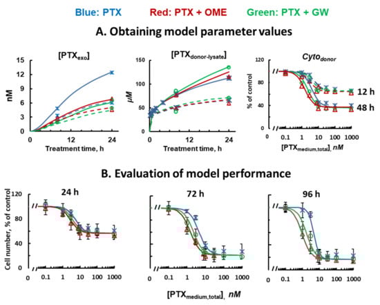 Model parameter estimation and model performance evaluation. (A) Model parameter estimation. Three PK and PD data sets obtained in MCF7 cells were used with the QP model (Equations (S2–S7) in Supplementary Materials) to estimate the best-fitting α and β values. Blue: single agent PTX. Red: PTX + OME pretreatment. Green: PTX + GW pretreatment. Left and middle panels: [PTXexo] vs. time and [PTXdonor-lysate] vs. time, respectively. Note the different concentration units. 300 nM [PTXmedium,total] (dotted curves) and 1000 nM [PTXmedium,total] (solid curves). Right panel: Cytodonor vs. [PTXmedium,total] for PTX treatments for 12 or 48 h. (B). Evaluation of QP model performance. Model-simulated Cytodonor of PTX treatments for 24, 72 and 96 h (curves) were compared to the experimental results (symbols; mean ± SEM, n = 3 experiments, duplicate samples per experiment); simulated results are within ±30% of observed mean values.
