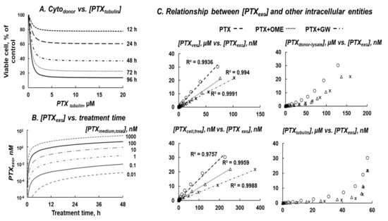 QP model-based simulations to evaluate PK and PD relationships between various intracellular PTX entities. (A) Cytodonor vs. [PTXtubulin]. (B) [PTXexo] as functions of [PTXmedium,total] and treatment time. The respective area-under-curve values after 48 h treatments are 0.015, 0.164, 1.828, 17.70, 93.35, and 513.0 nM × h at [PTXmedium,total] of 0.01, 0.1, 1, 10, 100, and 1000 nM. (C) Quantitative relationships between [PTXexo] and four intracellular entities ([PTXdonor-lysate], [PTXtubulin], [PTXves], [PTXcell,free]) in cells treated with 0.1 to 1000 nM PTX for 48 h, without or with OME (29 µM) and GW (10 µM). The respective r2 values for the regressed lines are >0.99 for [PTXves], 0.98 to >0.99 for [PTXcell,free], and 0.85 to 0.95 for [PTXdonor-lysate]. The relationships between [PTXexo] and [PTXtubulin] appeared biphasic with slower increases at lower [PTXtubulin] and higher increases at higher [PTXtubulin] (>50 µM).