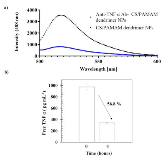 Free antibodies have been reported to present the capacity to neutralize the target agent, TNF α [27]. Herein, we aimed to investigate the biological activity of anti-TNF α conjugated CS/PAMAM dendrimer NPs in vitro. A monoclonal anti-TNF α antibody was linked to CS/PAMAM dendrimer NPs and the efficacy of the linking reaction, as well as the preservation of its biological activity (i.e., its ability to capture TNF α) were evaluated (Figure 1). Fluorescence spectroscopy was used to assess the success of conjugation (Figure 1a) with both previous conjugation of the CS/PAMAM dendrimer NPs (both with and without linked Ab) and a secondary antibody labeled with Alexa Fluor 488 dye. The intensity of the emission spectra of Alexa 488 between 500 and 600 nm for the anti-TNF α Ab-CS/PAMAM dendrimer NPs was significantly higher (≃3500) than CS/PAMAM dendrimer NPs without anti-TNF α Ab (≃800). Therefore, the conjugation of CS/PAMAM dendrimer NPs with the anti-TNF α Ab was successfully achieved, despite the fact that some unspecific secondary Ab binding was observed (as expected).