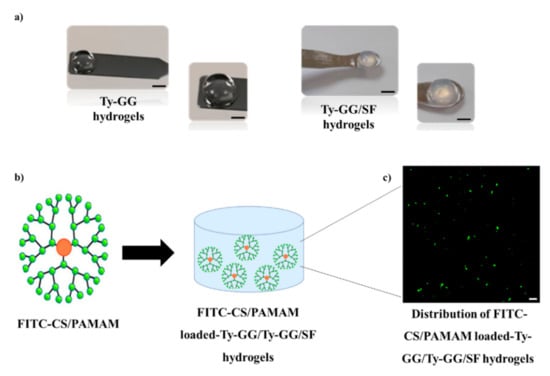 Anti-TNF α Ab-CS/PAMAM dendrimer NPs loaded-Ty-GG and Ty-GG/SF hydrogels. (a) Representative images of Ty-GG hydrogels and Ty-GG/SF hydrogels. Scale bar: 10 cm. (b) Schematic representation of FITC-CS/PAMAM dendrimer NPs and FITC-CS/PAMAM dendrimer NPs loaded-Ty-GG and Ty-GG/SF hydrogels. Scale bar: 5 μm. (c) Representative fluorescence image of FITC-CS/PAMAM dendrimer NPs distributed within Ty-GG and Ty-GG/SF hydrogels, showing the NPs in green.
