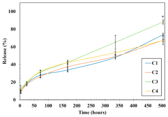 Release profile of anti-TNF α Ab-CS/ PAMAM dendrimer NPs. Release profile of anti-TNF α Ab-CS/ PAMAM dendrimer NPs from Ty-GG (C1 and C2) and Ty-GG/SF hydrogels (C3 and C4) with different crosslinking levels after 3, 24, 48, 72, 168, 336, and 504 h. Data shown as Mean ± SD. * indicates significant differences when comparing C3 and C4 at time point 504 h.