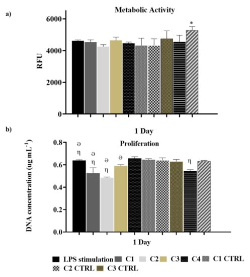 DNA quantification was used to assess THP-1 cells’ proliferation under different conditions. At day one, cell proliferation was decreased in C1, C2, C3, and C4 CTRL as compared to the LPS stimulated cells. However, this effect dissipated over seven days, with no final differences among the conditions. The lack of influence of the GG hydrogels and dendrimer nanoparticles over cell viability has been previously known for over a decade [35,36].