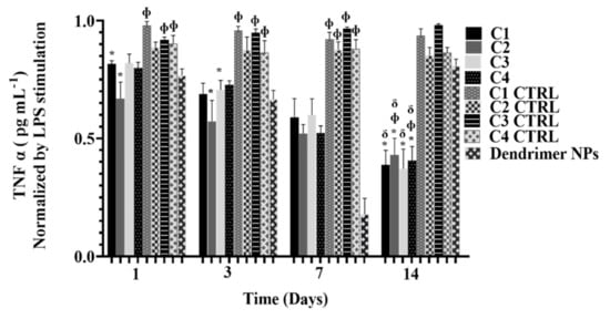 Quantification of TNF α free in the culture medium along 14 days of culture. Results were normalized by the TNF α values obtained in cultures stimulated by LPS. Data shown as Mean ± SD. * indicates significant differences when comparing with respective CTRL. Φ indicates significant differences when comparing with Dendrimer NPs at each time-point. δ indicates significant differences when comparing with day one.