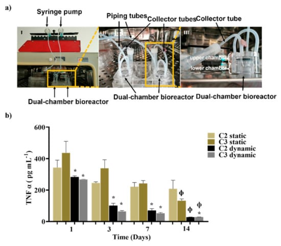 Evaluation of anti-TNF α Ab-CS/ PAMAM dendrimer NPs loaded-Ty-GG and Ty-GG/SF hydrogels effects under dynamic conditions. (a) Representative images of Dynamic culture of THP-1 cell-based inflammation in vitro model using a dual-chamber bioreactor showing the (I) dual-chamber bioreactor connected to a syringe pump; (II) higher amplification of the bioreactor inserted in a 6-well plate showing the piping tubes and collector tubes; and (III) enlarged image of the dual-chamber bioreactor where it is possible to see the upper and lower chamber. (b) Amount of TNF α present in the medium, in contact with C2 and C3 in static and dynamic conditions. Data shown as Mean ± SD. * indicates significant differences when comparing dynamic conditions with static conditions, Φ indicates significant differences when comparing with day 1.