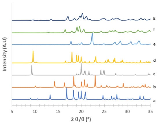 PXRD patterns of the supposed mannitol α form (g) prepared in a saturated methanol solution using 2% of PVA (f) 1% of PVA, (e) without PVA. Patterns of all polymorphs are added as references (a) α form CCDC 224658, (b) β form CCDC 224659, (c) δ form CCDC 224660, (d) hemihydrate form CCDC 251528.