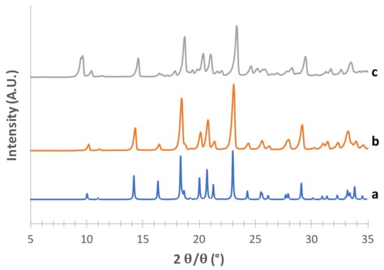 As for the supposed β form (Figure 2), the superimposition with the pattern reconstructed from CCDC data (deposition number 224,659, [35]) was quite good for the powders obtained with both crystallization methods, in particular for the characteristic peaks at 2θ = 10.11°, 2θ = 14.27°, the most intense peak at 2θ = 23.07° and the peak at 2θ = 20.09° (see Supplementary Table S2).