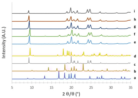 PXRD patterns of mannitol δ form (i) obtained using acetone as an antisolvent with 3% PVP (h), 2% PVP (g), 1% PVP (f), 0.5% PVP (e) without PVP. Patterns of all polymorphs are added as references (a) α form CCDC 224658; (b) β form CCDC 224659; (c) δ form CCDC 224660; (d) hemihydrate form CCDC 251528.