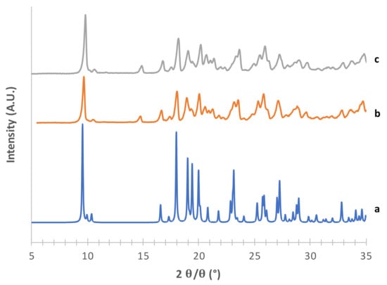 PXRD patterns of mannitol β form (c) obtained using acetone as an antisolvent. (b) By freeze drying technique; (a) CCDC 224659 as a reference.