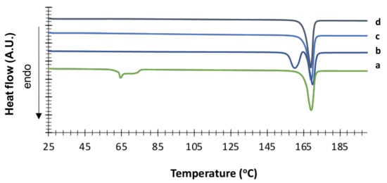 DSC traces of crystallized mannitol forms: (a) hydrate; (b) δ form (1% PVP); (c) β form; (d) α form (2% PVA).