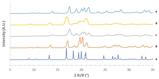 The hydrate form of mannitol was obtained by freeze-drying with final drying at 25 °C for 4 h at 0.1 mbar [36]. A hemihydrate solid phase was isolated (Figure 4), although not in a pure form (see extra reflection at around 15° 2θ and Supplementary Table S4)). However this form was not stable enough, as it easily dehydrated at room temperature, converting into the anhydrous form [25]. For this reason, its crystalline form was characterized, but it was not used for the preparation of adhesive mixtures with the drug used in the second phase of the work.
