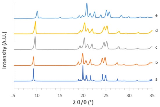 PXRD patterns of mannitol α form recorded at (b) time zero; (c) 1 month; (d) 12 months (e) 24 months storage at 40 °C and 75% R.H. (a) CCDC 224658 as reference.