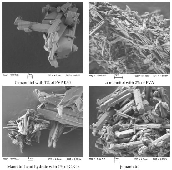 Starting from the work of Cares-Pacheco et al. [23] (for the α form) and Vanhoorne et al. [29,33] (for the δ form), modified crystallization procedures were developed in order to isolate four mannitol solid phases suitable for the production of binary mixtures with the selected micronized API in terms of kinetic stability and physical characteristics such as shape and particle size distribution.
