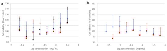 Viability of A549 cells after 24 h of contact with (a) mannitol polymorphs α (red square), β (black circle), δ (blue triangle), or (b) corresponding nominal amounts of doping agents PVA (red square) or PVP (blue triangle). The bars represent standard deviation (n = 6).