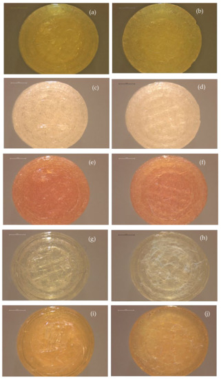 Top (left images) and bottom (right images) image of printlets obtained with: (a,b) M 50, (c,d) M 35 Span, (e,f) M 35 SLS, (g,h) M Placebo Span and, (i,j) M Placebo SLS. Scale refers to 2 mm.