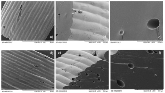 SEM images of printlets: (a–c) obtained with M 35 Span, and (d–f) obtained with M 35 SLS.