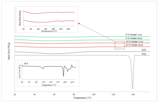 DSC, XRPD, and Raman mapping were used to characterise the solid state of the printlets. DSC thermograms confirmed the crystalline nature of the pure drug by the presence of a sharp melting endotherm at ~140 °C, and the amorphous state of the polymer KOL (Figure 4), as reported previously in the literature [56,57,58,59]. Although an endothermic event was observed in the HME powdered material and mainly after milling (data not shown), its low intensity allows us to conclude that P 50 and M 50 powdered materials were predominantly amorphous before printing due to the melting process in HME. These physical characteristics were maintained after printing for both formulations, where the P 50 remained amorphous while the DSC thermogram of the M 50 printlet shows an endothermic peak visualised in the range of 120–122 °C with ΔHfusion 2.15 J/g. However, the crystallinity is similar to that evidenced in the material before printing and cannot be attributed to the presence of the crystalline PZQ ( ~ 136 °C) or one of the polymorphs of PZQ, B, or C, for which the melting temperatures described in the literature are different (around 106 and 112 °C, respectively) [58,59,60]. The endothermic event shown in Figure 4 can be related to the effect of the polymer on lowering the melting temperature of the drug in the mixture. Figure 4 also shows the homogeneity of the printlets, with no differences in their characteristics measured in the core and on the border.