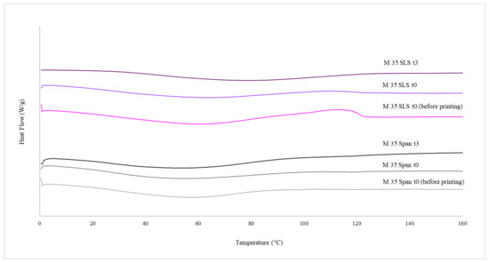 Figure 5 displays the DSC thermograms for printlets containing 35 wt% PZQ with surfactants (Span or SLS). The amorphous nature of M 35 Span and M 35 SLS materials subjected to HME before printing was confirmed, with no evidence of crystalline PZQ due to the absence of a melting event and the presence of a single glass transition (33 °C and 0.37 J/g.; 25 °C and 0.36 J/g., respectively). The amorphous pattern after printing (M 35 Span and M 35 SLS printlets) remained unchanged (t0), and no evolution was detected by DSC analysis after three months of storage at 25 °C, 60% RH (t3).