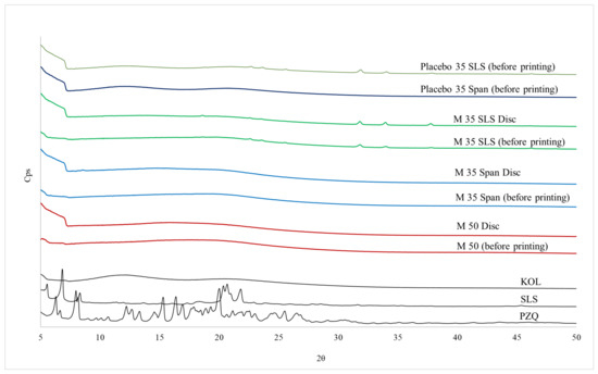 XRPD diffractograms of all raw, powdered, and printed materials are grouped in Figure 6. The crystalline nature of the raw PZQ and SLS are confirmed by the sharp peaks, in line with the data already described in the literature for the commercial racemic molecule [14,60]. Likewise, the polymer (KOL) also presents a characteristic halo of amorphous material. The amorphous nature of powdered materials and their respective printlets (M 35 Span) previously found in the DSC analysis are also confirmed by XRPD diffractograms. However, the M 35 SLS printlet was the only material presenting some diffraction signals, indicating the presence of crystalline material. It could be verified during this study that these signals are also identified in absence of the drug in the placebo formulation (Figure 6), being related to some structural change in the surfactant (SLS), which was not further investigated here. Unlike the DSC results, the printlet M 50 showed no signs of diffraction, indicating that the sample may be amorphous or the drug in crystalline state is in a proportion under the detection limits of the XRPD technology.