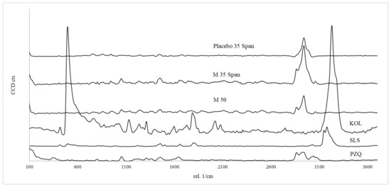 Raman microscopy results for the raw materials (PZQ, SLS, and KOL) and printlets (M 50, M 35 Span, and Placebo 35 Span).