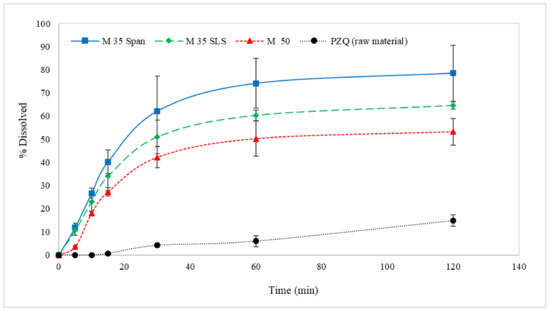 In vitro dissolution profiles of PZQ (raw material) and printlets (M 50, M 35 SLS, and M 35 Span).