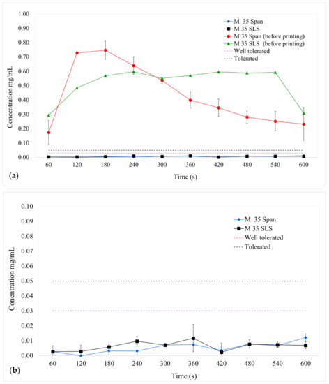 M 35 Span and M 35 SLS milled materials before printing released more than 0.2 mg/mL of PZQ in the artificial saliva in the first minute of the experiment (Figure 10a). Münster et al. [63] found that the half maximal inhibitory concentration (IC50) for a PZQ taste response was 0.06 mg/mL when tested with the rat BATA model. The dashed lines indicate the PZQ taste tolerability thresholds they found and are classified as tolerable (0.05 mg/mL) and well tolerable (0.03 mg/mL). Therefore, when ingesting a drug in the particulate form, i.e., a powder formulation for dispersion, the bitter and unpleasant taste of PZQ is likely to be present in the mouth immediately upon administration, at a level triggering aversion. The 3D printed formulations exhibited a significantly lower drug release, even after 600 s, than the M 35 Span and M 35 SLS HME milled extrudates before printing (Figure 10a), demonstrating that the 3DP step was key for successful taste masking. As shown in Figure 10b, both printlets (M 35 Span and M 35 SLS) were below the threshold of good tolerability of the PZQ and even further below the PZQ IC50 (0.06 mg/mL), indicating that the formulations provided efficient taste masking without the use of additional taste masking excipients.