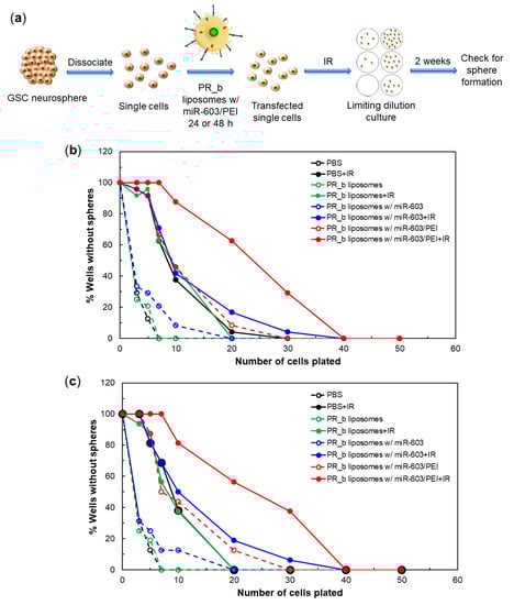 The treatment scheme of the radiation sensitivity experiment is summarized in Figure 4a. Expectedly, treatment with 6 Gy of IR resulted in an increase in the seeding density required for sphere formation, associated with a rightward shift in the proliferative potential curve. No significant change in seeding density requirement was observed if the radiation was carried out 24 or 48 h after treatment with PBS, empty liposomes, or PR_b liposomes encapsulating free miR-603 (Figure 4b,c). Results suggest these treatments did not significantly influence glioblastoma growth potential or radiation sensitivity. In contrast, treatment with PR_b liposomes encapsulating miR-603/PEI complexes for 24 or 48 h significantly increased the seeding density required for sphere formation (shifted the sphere formation curve to the right), suggesting that the treatment enhanced radiation sensitivity (Figure 4b,c).