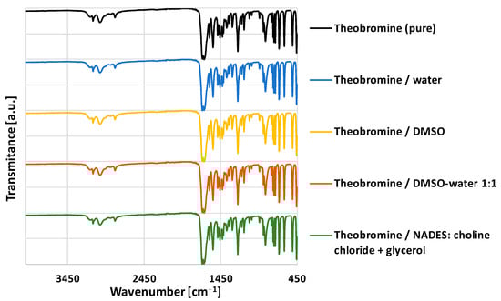 Theobromine exists in only one stable crystal form [89] and crystallizes in P21/c system with a = 9.2990, b = 18.6980, c = 9.0381 Å and with Z = 8 [90]. No polymorphism was determined for this compound. Additionally, contrary to caffeine [91] and theophylline [92], it does not easily form hydrates and remains in its anhydrous form even immersed in water for 24 h [93]. It is then expected that no changes in the form of theobromine will occur when comparing the pure compound initially used for solubility studies and the sediment obtained after experiments. However, in order to confirm this, a series of FTIR-ATR experiments were performed and selected results were summarized in Figure 2, which shows the FTIR spectra of Theobromine residues after measuring its solubility in different solvents.
