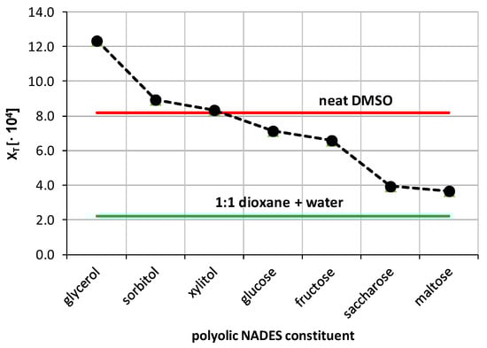 For all of the studied NADES the largest solubility of theobromine was found for the water-NADES composition with = 0.8. In this point the order of increasing solubility is the same as for pure NADES, namely glucose > xylitol > sorbitol > glycerol and the differences are most pronounced for the compositions yielding the largest solubilities. For glycerol the largest solubility was equal xT = (15.59 ± 0.17)·10−4; c = 5.12 ± 0.07 mg/ml, for sorbitol xT = (10.96 ± 0.03)·10−4; c = 3.06 ± 0.01 mg/ml, for xylitol xT = (10.03 ± 0.05)·10−4; c = 2.99 ± 0.02 mg/ml and for glucose xT = (9.22 ± 0.08)·10−4; c = 2.56 ± 0.02 mg/ml. For the most efficient composition, including choline chloride and glycerol, the obtained solubility of theobromine was almost 32 times larger than for water and about 1.5 times larger than for neat DMSO. The pattern of solubility changes is different for NADES comprising glycerol than for the other three with a more pronounced solubility increase starting from = 0.8. In all studied cases also the composition with NADES content equal = 0.68 resulted in larger solubilities than pure natural deep eutectic solvents, although the difference was quite small. Detailed results of theobromine solubility in both pure NADES and NADES-water mixtures can be found in Tables S5 and S6 in Supplementary Materials.